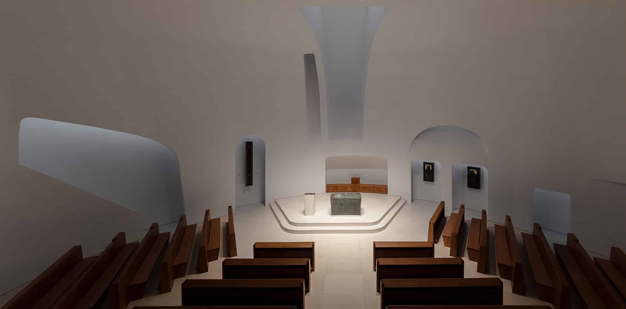 A templom a fények játékának mesteri színtere. Az építészeti megoldások bravúros harmóniájának köszönhetően a természetes fény keresztül-kasul bejárja a szentélyt és a hajót, vagyis a középkori templomépítészeti hagyományt követően a fény rajzolja körül a szakrális teret. A félköríves elrendezés miatt a templom minden napszakban, szinte óráról órára követi az idő múlását, mintha egy hatalmas napóra számlapján vándorolna körbe a napsugár. A napóra szimbolikát erősíti az épület különálló tornya is, amely – kereszttel a tetején – mintegy óramutatóként magasodik az ég, a Jóisten felé. A harangtoronyban egyébként öt harang lakik, melyeket Szent Imre, Szent István, a második világháborúból való megmenekülés, Szent Erzsébet és Szent Gellért tiszteletére öntöttek.